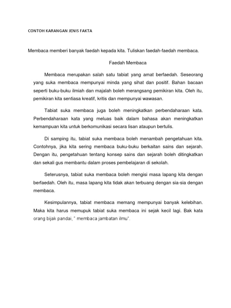 CONTOH KARANGAN JENIS FAKTA Membaca memberi banyak faedah kepada kita. Mungkin kebanyakan pelajar akan mengetahui tentang hal ini. Contoh di atas serta boleh digunakan untuk karangan tingkatan 1.